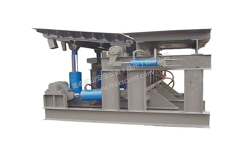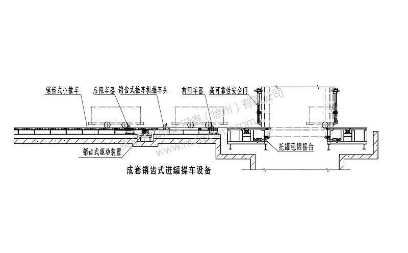 操車系統成套技術設備是由銷齒推車機、搖臺(搭接搖臺、托罐搖臺、托罐鎖罐搖臺)阻車器、安全門、液壓系統、電控及信號系統等部分組成。該套系統靈活組合和布置,可以滿足各礦井不同提升形式、運輸方式和現場安裝空間尺寸的要求。